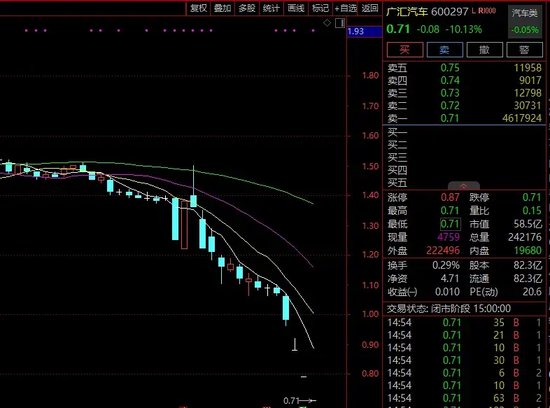 广汇汽车最新收盘价为0.71元/股,已经连续4个交易日收盘价低于1元,而且广汇汽车卖盘凶猛,在跌停板位置有接近462万手卖盘,因为股本大,市值还有58.46亿元。